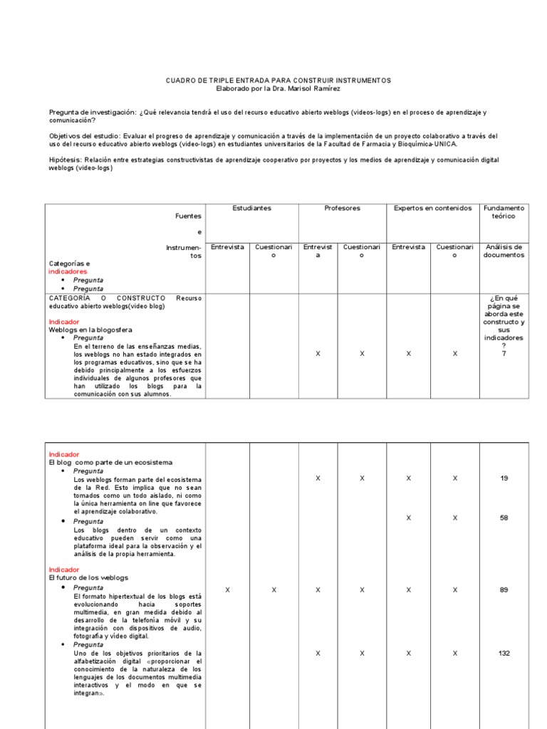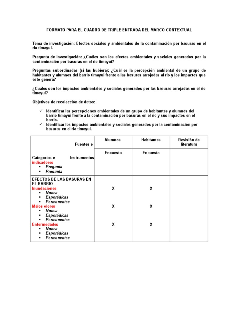 Para construir el cuadro de triple entrada de la investigación debemos tener muy clara cuál es la pregunta de investigación a la que intentamos responder cuáles son las preguntas subordinadas si las hubiera cuáles son los objetivos del estudio cuáles son los supuestos que nos. El cuadro de triple entrada de la investigación debemos tener muy clara cuál es la pregunta de investigación a la que intentamos responder cuáles son las preguntas subordinadas si las hubiera cuáles son los objetivos del estudio cuáles son los supuestos que nos formulamos y con qué teoría contamos. 0 calificaciones 0 encontró este documento útil 0 votos 1K vistas 1 página.
