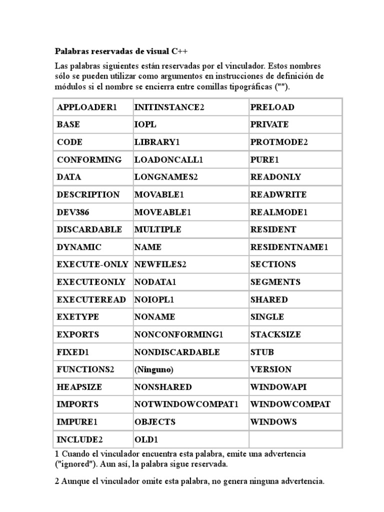 Son palabras que tienen un significado especial para el lenguaje y no se pueden utilizar como identificadores. El primero contiene las palabras de C y que C como evolución de C también contiene. Palabras reservadas en C.